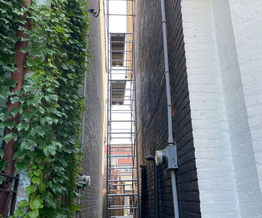 The brick was painted and the windows were sprayed. Metal fence and plastic siding were also sprayed. The narrow area required scaffolding to reach the peak.