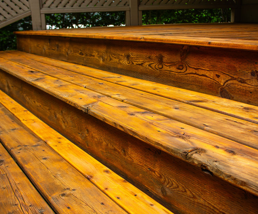 Pressure wash deck with a restoration formula & brightener to remove dirt and grey fibers