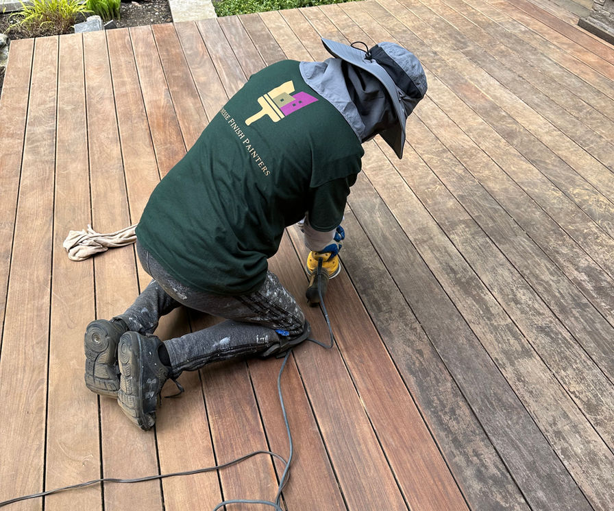 The IPE deck was THOROUGHLY sanded w/ 40 grit to remove existing coatings. Hardwood decks require 40 grit paper due to their hard nature